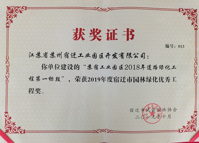 蘇宿工業(yè)園區(qū)2018年道路綠化工程榮獲“2019年度宿遷市園林綠化優(yōu)秀工程獎(jiǎng)”稱號