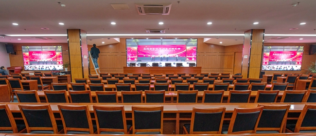 經(jīng)過改造,安全教育館新增3塊LED屏幕,其中主席臺(tái)處主LED顯示屏面積約20平方,東西兩側(cè)輔助LED顯示屏各約6平方。LED屏幕采用顯示單元像素間距為P2-2.5,具有顯示面積大、分辨率高、超高對(duì)比度、超寬視角、無縫拼接、維護(hù)方便等優(yōu)點(diǎn)。改造后進(jìn)一步提升了視頻會(huì)議效果,增加了會(huì)場(chǎng)多功能性。
