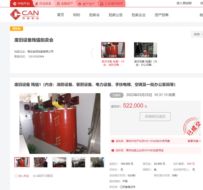 3月25日上午10時(shí),城發(fā)公司一批廢舊消防設(shè)備、餐廚設(shè)備、電力設(shè)備、手扶電梯、空調(diào)等物資在中拍平臺公開拍賣,經(jīng)過30分鐘的緊張激烈競價(jià),最終以522000元成交標(biāo)的,比評估價(jià)180000元高出342000元,溢價(jià)率190%。
