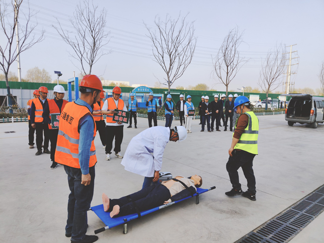 本次演練共分6個小組,分別為:現(xiàn)場模擬組、現(xiàn)場警戒(搶修)組、應(yīng)急救援(疏散)組、通訊聯(lián)絡(luò)組、事故調(diào)查組、 觀摩組。假設(shè)工人在生活區(qū)違規(guī)使用大功率電器突發(fā)火災(zāi),被煙霧和火勢圍困,二樓有人發(fā)出救援信號,正在附近巡查的安全員發(fā)現(xiàn)情況后,立即趕赴現(xiàn)場并打電話給項目生產(chǎn)負責(zé)人,在接到通知后,項目生產(chǎn)負責(zé)人迅速安排項目部應(yīng)急救援辦公室負責(zé)人,并啟動應(yīng)急預(yù)案,各救援小組立即到達現(xiàn)場開展工作,安全員迅速引導(dǎo)全體人員有序從疏散樓梯疏散到安全位置,救援組帶著擔(dān)架、急救箱等趕赴現(xiàn)場,將“受傷”人員用擔(dān)架從房內(nèi)撤離到安全位置,同時救援醫(yī)生對“受傷”人員進行簡單的心肺復(fù)蘇、人工呼吸,并迅速送往醫(yī)院進行治療。