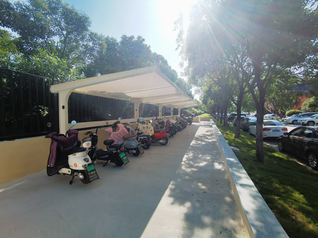 本次共建設17處膜結構車棚,總約1100m2,共可停放380余輛非機動車,新車棚干凈明亮、設施齊全,既解決了停車需求,又消除了工業(yè)坊內的電動車安全隱患,得到了進駐工友的一致好評。