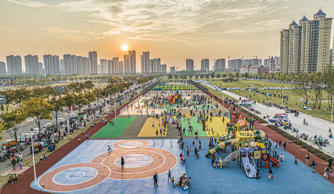 玄武湖西路北側(cè)臨時(shí)健身公園占地面積約2.2萬平方米,內(nèi)部設(shè)置720米健身跑道、全齡段健身區(qū)、綜合兒童活動(dòng)區(qū)、平地輪滑場、廣場舞區(qū)及各類球場(籠式籃球場4組、7人制籠式足球場1組、羽毛球場4組、網(wǎng)球場一組)等6項(xiàng)主題運(yùn)動(dòng)功能,滿足周邊群眾“一站式”運(yùn)動(dòng)健身需求。場地建成后先后登上人民日?qǐng)?bào)頭版、新華日?qǐng)?bào)、學(xué)習(xí)強(qiáng)國等國家主流媒體,園區(qū)充分利用閑置待開發(fā)地塊空間,積極構(gòu)建“10分鐘健身圈”,獲得周邊居民的認(rèn)可和喜愛。