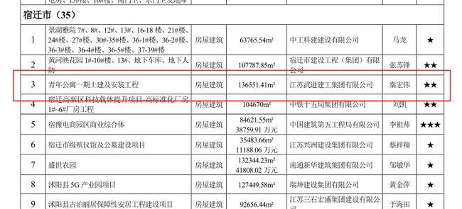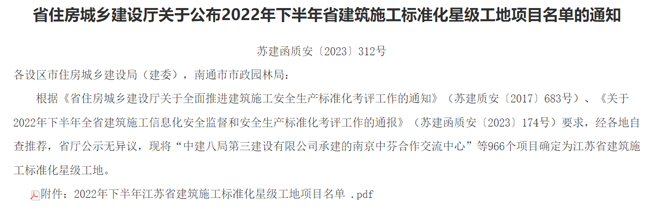 近期,省建設(shè)廳下發(fā) 《 關(guān)于公布2022年下半年江蘇省建筑施工標(biāo)準(zhǔn)化星級(jí)工地公示名單 》的通知,城發(fā)公司投資建設(shè)的青年公寓一期土建及安裝工程喜獲“江蘇省建筑施工標(biāo)準(zhǔn)化星級(jí)工地”(二星)稱(chēng)號(hào)。該榮譽(yù)的獲得是公司扎實(shí)推進(jìn)省安全生產(chǎn)標(biāo)準(zhǔn)化建設(shè),落實(shí)上級(jí)關(guān)于推進(jìn)安全生產(chǎn)標(biāo)準(zhǔn)化建設(shè)工作部署的要求,建立健全管理機(jī)制,積極開(kāi)展安全文明標(biāo)準(zhǔn)化工地創(chuàng)建所取得的成果,為全省樣板化示范,有效提升建筑施工水平,安全生產(chǎn)發(fā)揮了引領(lǐng)作用。