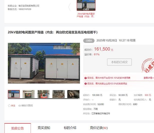 近日,城發(fā)公司青年公寓臨時電項目一批閑置資產(chǎn)在中拍平臺公開拍賣,經(jīng)過27分鐘的緊張激烈競價,最終以161500元成交標的,比評估價100500元高出61000元,溢價率61%。