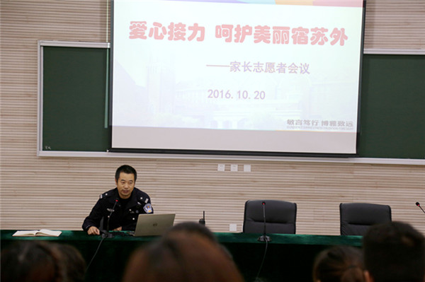 校園安全是學(xué)校發(fā)展的首要工作,更是創(chuàng)建文明校園的重要保障。近日,宿遷市蘇州外國語學(xué)校召開了家長志愿者會議,宿遷市交警支隊干警和五十名愛心家長以及學(xué)校相關(guān)行政人員參加了本次活動,大家齊聚一堂,共同討論并確定了本學(xué)期的家長志愿者工作安排。